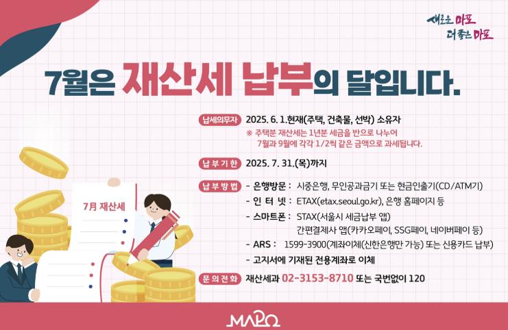 [뉴스다컴] 마포구는 7월 정기분 재산세 납부의 달을 맞아, 구민들이 기한 내 납부할 수 있도록 적극적인 홍보와 납부 독려에 나섰다.