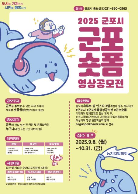 [뉴스다컴] 군포시는 시민 참여형 영상 콘텐츠 발굴을 위해 오는 9월 8일부터 10월 31일까지 2025 군포시 숏폼영상 공모전 ‘군포숏폼’을 개최한다고 밝혔다.