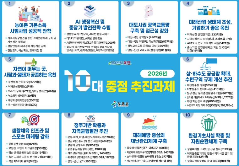 [뉴스다컴] 옥천군이 26일 2026년 군정 운영의 핵심 방향을 담은 10대 중점 추진과제를 발표하고, 군민 삶의 질 향상과 지속가능한 지역성장을 위한 정책 추진에 나선다.