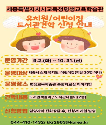 [뉴스다컴] 세종특별자치시교육청평생교육학습관은 유아들의 도서관 이용 생활화를 유도하고 올바른 독서 습관을 형성하기 위해 ‘2025년도 하반기 도서관 견학 프로그램‘ 참여기관을 7월 14일부터 25일까지 모집한다고 밝혔다.