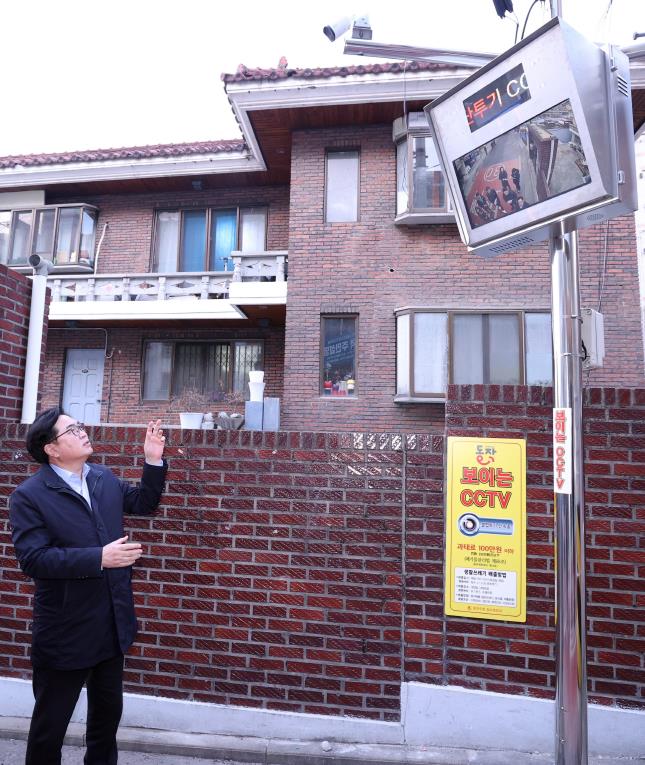▲ 박일하 동작구청장 지난해 2월 관내 상도4동 이면도로에 설치된 ‘보이는 CCTV’ 작동 상황을 점검하고 있다. |