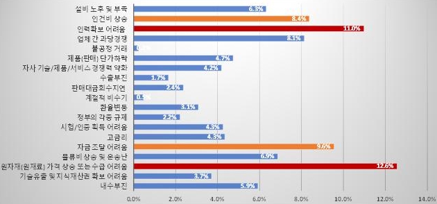 경영상 애로사항으로는 원자재 가격 상승 및 수급 어려움, 인력 확보의 어려움, 자금 조달의 어려움 순으로 애로사항이 크다고 조사됐다.