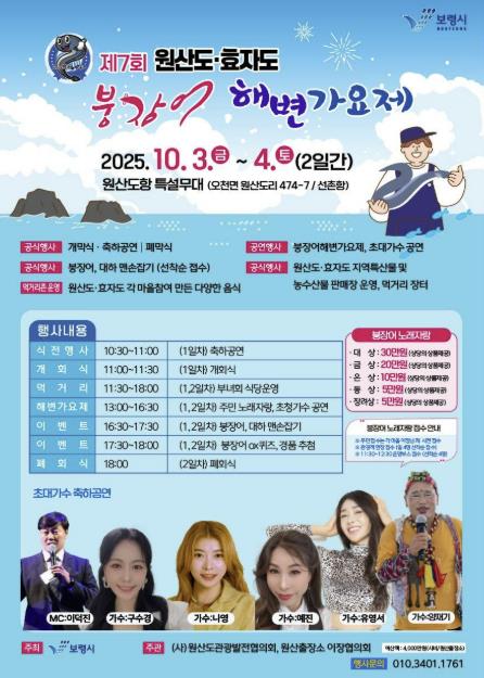 [뉴스다컴] 보령시가 주최하고 (사)원산도관광발전협의회가 주관하는 ‘제7회 원산도·효자도 붕장어 해변가요제’가 오는 10월 3일부터 4일까지 2일간 원산도항 특설무대에서 개최된다.