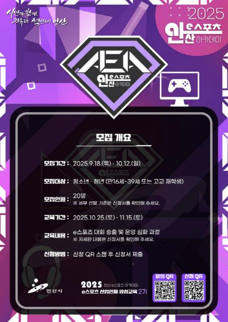 [뉴스다컴] 안산시는 오는 18일부터 e스포츠 산업 진출을 꿈꾸는 청년들을 대상으로 ‘2025 안산 e스포츠 아카데미 산업인재 양성교육 2기’ 참가자를 모집한다고 17일 밝혔다.