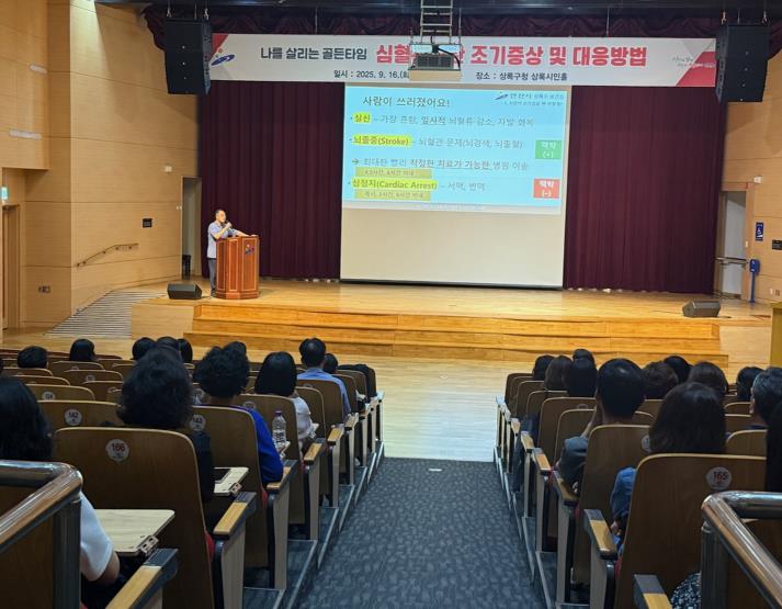 ▲ 신승용 교수가 상록구청 시민홀에서 안산시 공직자들을 대상으로 ‘심혈관질환 조기 증상 및 대응 방법’에 대한 교육을 진행하고 있다. |