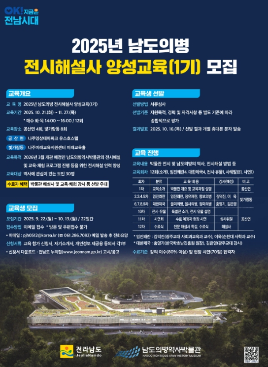 [뉴스다컴] 전라남도는 2026년 3월 개관 예정인 남도의병역사박물관에서 활동할 전시해설사와 교육·체험 강사 양성을 위해 오는 10월 13일까지 교육생 30명을 모집한다고 밝혔다.