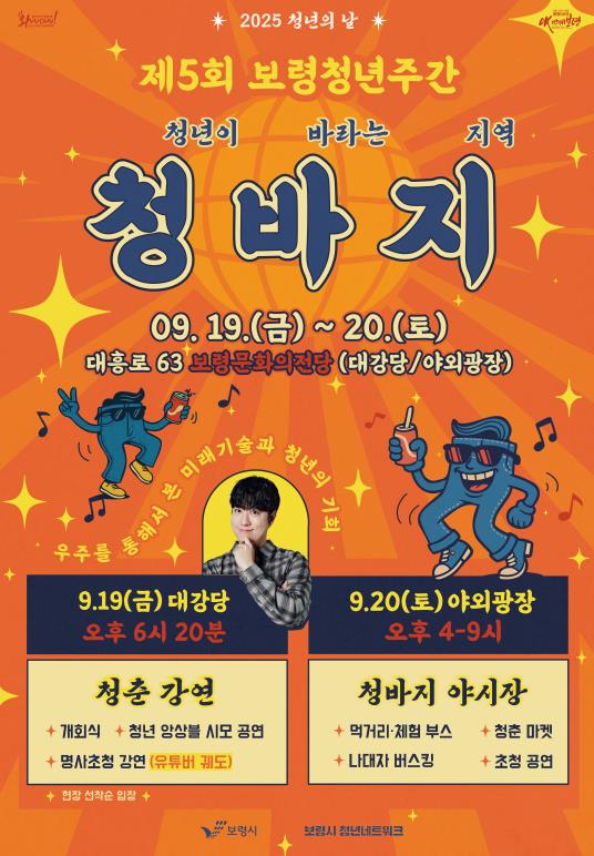 [뉴스다컴] 보령시는 오는 9월 19일부터 20일까지 2일간 보령문화의전당에서 ‘제5회 보령청년주간’을 개최한다. 올해 행사는 ‘청년이 바라는 지역, 청.바.지 야시장’이라는 주제로, 청년들이 직접 기획하고 운영하는 지속 가능하고 세대를 아우르는 문화 축제로 거듭난다.
