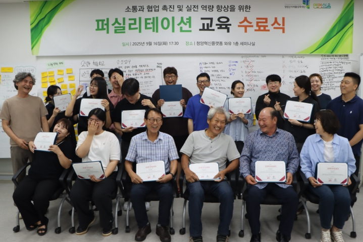 [뉴스다컴] 청양군지역활성화재단은 지난 16일 청양군 혁신플랫폼 와유 1층 세미나실에서 ‘2025년 퍼실리테이션 교육’ 수료식을 열고, 3일간의 교육 과정을 성공적으로 마무리했다고 밝혔다.