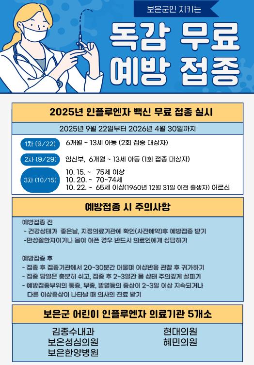 예방접종은 △김종수 내과 △현대의원 △보은성심의원 △혜민의원 △보은한양병원 등 5개 의료기관에서 받을 수 있으며 일정은 △2회 접종 대상 어린이는 9월 22일부터, △1회 접종 대상 어린이와 임신부는 9월 29일부터 접종이 가능하다. 또한 보은군보건소는 오는 10월 22일부터 다자녀가정 무료 접종을 비롯해 어린이 및 임신부 접종을 진행한다.