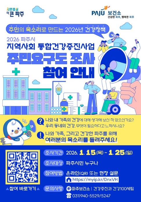 [뉴스다컴] 파주시는 시민의 건강한 삶을 지원하기 위해 '2026년 지역사회 통합건강증진사업’추진에 앞서 주민건강요구도 조사를 실시한다.
