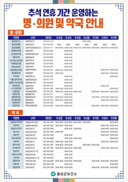 또한, 추석 당일인 10월 6일에는 횡성군보건소에서 오전 9시부터 오후 6시까지 일반진료를 실시하여 군민들의 의료서비스 불편을 최소화할 방침이다.