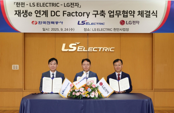 한전은 9월24일 LS ELECTRIC 천안사업장에서 LS ELECTRIC, LG전자와 ‘재생에너지 연계 DC Factory 구축’을 위한 업무협약(MOU)을 체결했다. 이번 협약은 K-DC Alliance의 핵심 실증사업이자, ‘한국형 차세대 전력망’ 구축의 일환으로 추진됐다.