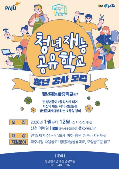 [뉴스다컴] 파주시는 2026년 1월부터 12월까지 청년을 대상으로 '청년재능공유학교' 청년강사를 연중 상시 모집한다.