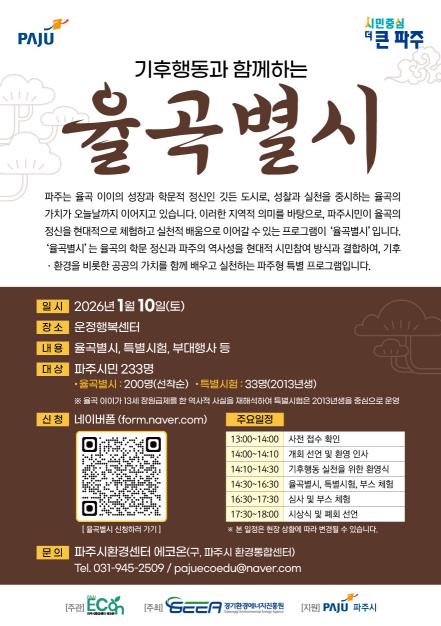 [뉴스다컴] 파주시환경센터 ‘에코온’은 파주를 대표하는 조선시대 사상가 율곡 이이의 학문 정신을 현대적 기후행동 가치로 재해석한 기후문화축제 ‘기후행동과 함께하는 율곡별시’를 오는 내년 1월 10일 운정행복센터에서 개최한다.