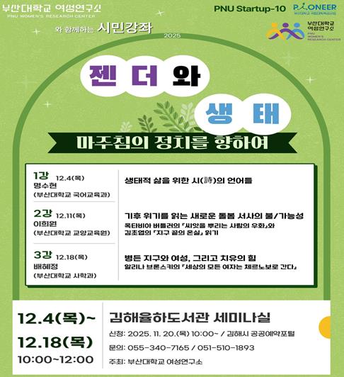 강좌는 ▲부산대 국어교육과 명수현 강사의 현대시를 통한 생태적 감수성에 대해 살펴보는 강의를 시작으로, ▲부산대 교양교육원 이희원 강사와 기후 위기 속 새로운 돌봄 서사를 문학 작품과 함께 고찰하며 ▲부산대 사학과 배혜정 강사가 생태 위기에 내재한 젠더 불평등을 역사·문학적으로 분석하는 순으로 이어진다.