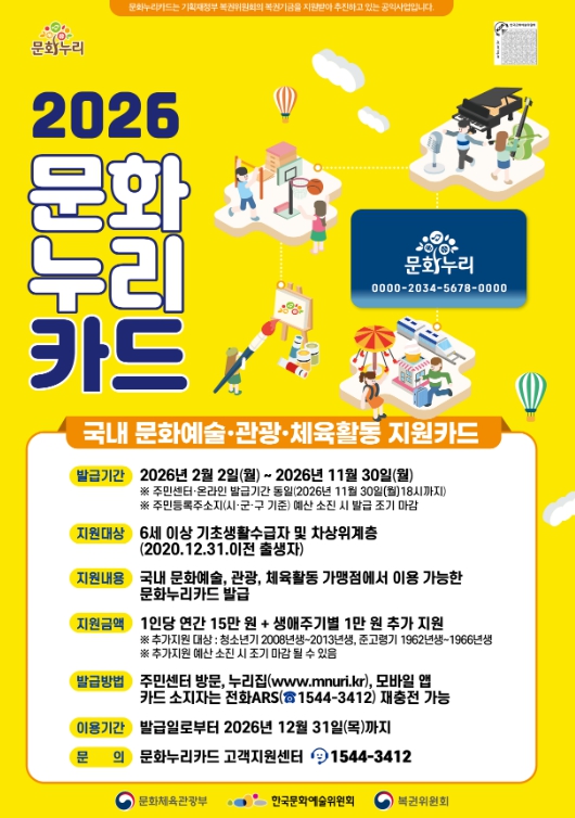 문화누리카드는 6세 이상 기초생활수급자와 차상위계층을 대상으로 문화예술·관광·체육활동 분야에 사용할 수 있는 전용 카드로, 기존 1인당 연간 14만 원이던 지원금이 2026년부터 15만 원으로 인상된다.