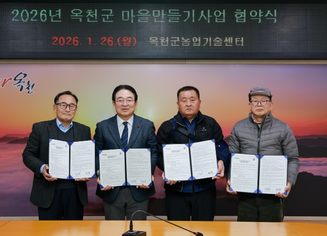 [뉴스다컴] 옥천군은 1월 26일 오후 2시, 옥천군농업기술센터 2층 소회의실에서 ‘2026년 옥천군 마을만들기사업 협약식’을 열고 동이면 금암2리, 안남면 도덕1리, 청산면 한곡리 등 3개 마을과 협약을 체결했다.