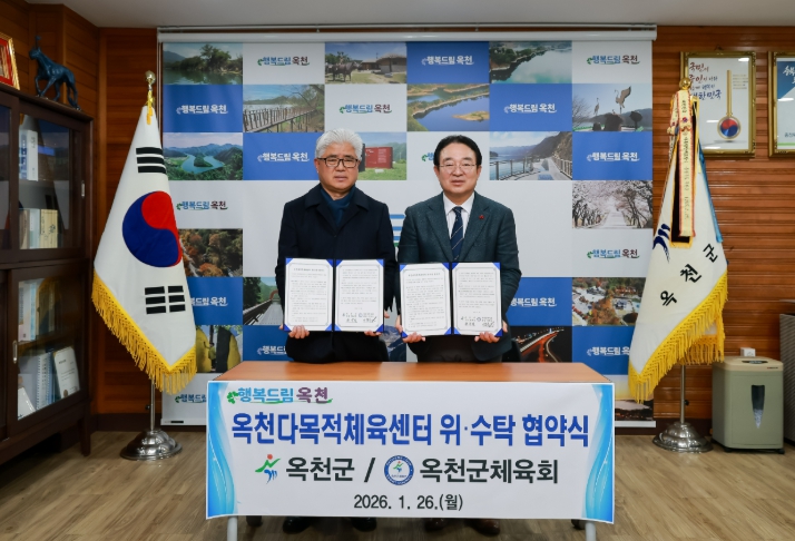 [뉴스다컴] 옥천군은 26일 지역 생활체육의 새로운 거점이 될 ‘옥천다목적체육센터’의 효율적인 관리와 전문적 운영을 위해 옥천군체육회(회장 이철순)와 위·수탁 협약을 체결했다고 밝혔다.