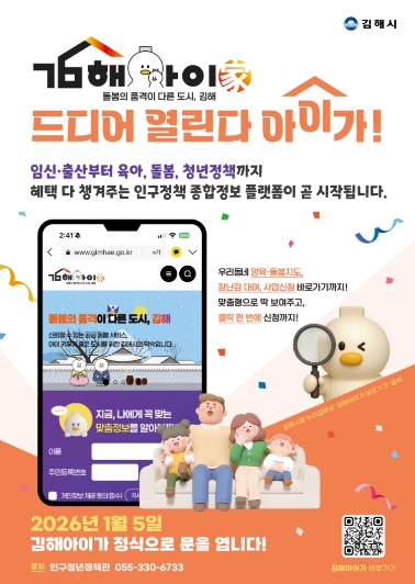 [뉴스다컴] 김해시는 시민 누구나 임신부터 출산, 육아, 돌봄, 청소년, 청년 지원정책까지 한눈에 확인하고 신청할 수 있는 인구정책 종합정보 플랫폼‘김해아이가(家)’를 오는 5일 정식 오픈한다고 2일 밝혔다.