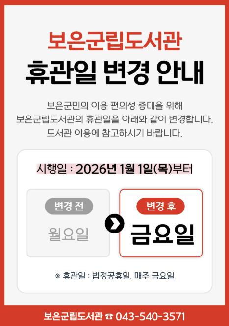 [뉴스다컴] 보은군립도서관은 2026년 1월부터 정기휴관일을 기존 매주 월요일에서 금요일로 변경해 운영한다고 밝혔다.