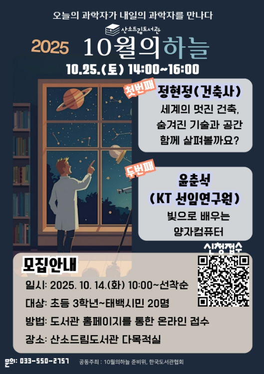 [뉴스다컴] 태백시는 산소드림도서관이 한국도서관협회와 ‘10월의 하늘’ 준비위원회가 공동 주최하는 재능기부 도서관 과학강연 '10월의 하늘' 공모사업에 선정됐다고 밝혔다.