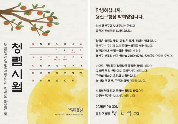 특히 긴 추석 연휴 기간을 맞아 구는 이번 ‘청렴시월 서한문’을 통해 구민에게 투명하고 공정한 행정의 메시지를 전하고 있다. 박희영 구청장은 “청렴은 행정의 뿌리이자 신뢰를 지켜내는 힘”이라며 “이번 청렴 서한문이 명절의 따뜻한 마음과 어우러져, 구민과 함께 더 청렴한 용산을 만들어가는 계기가 되길 바란다”라고 강조했다.