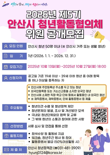 시는 제5기 청년활동협의체 위원으로 총 50명을 모집한다. 공고일 기준으로 안산시에 거주하거나 안산시에서 활동 중인 19세~39세 내·외국인 청년이라면 누구나 지원이 가능하다.