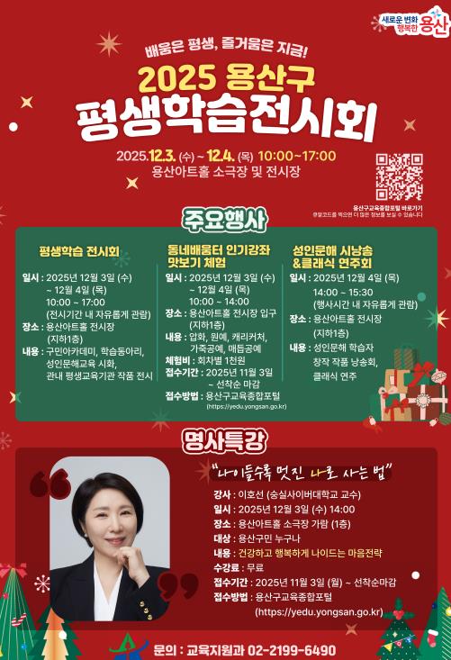 [뉴스다컴] 서울 용산구가 오는 12월 3일부터 4일까지 용산아트홀 전시장과 소극장에서 ‘배움은 평생, 즐거움은 지금!’을 주제로 ‘2025 평생학습 전시회’를 개최한다.