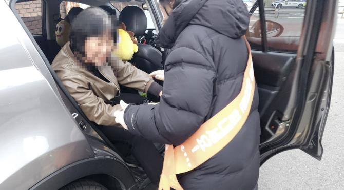 | ▲ 71세 고령 응시생이 자원봉사자 차량의 도움을 받아 수험장으로 이동하고 있다 |
