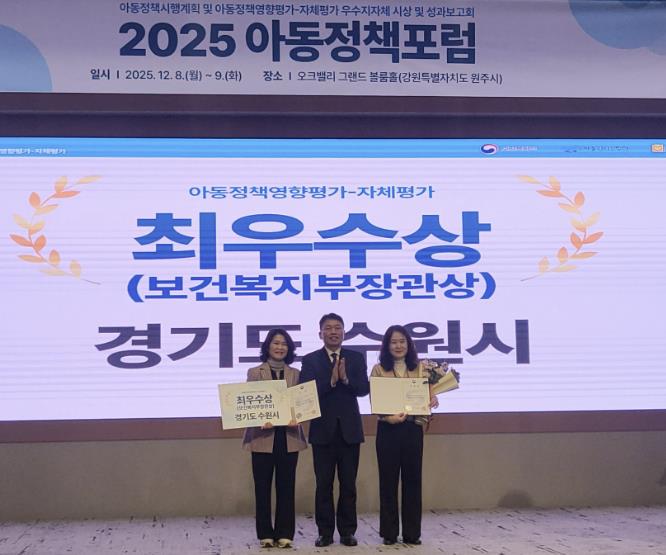 [뉴스다컴] 수원특례시가 보건복지부·아동권리보장원이 주관하는 ‘2025년 아동정책영향평가’에서 우수 지자체로 선정돼 보건복지부장관상을 받았다. 시상식은 8일 원주시 오크밸리리조트에서 열린 ‘제13회 아동정책포럼’ 중 진행됐다.