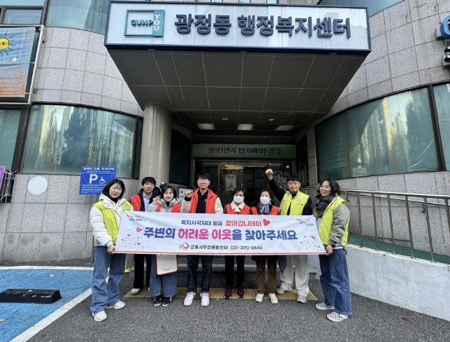 11월은 군포시 무한돌봄센터와 광정동, 대야동 맞춤형복지팀 직원들과 협업하여 다세대 주택이 밀집한 지역 및 고시원 방문 홍보, 산본중심상가 거리홍보 등을 통해 위기가구 유형과 제보 방법이 안내된 홍보문을 전달하는 등 주민들에게 좀 더 밀착된 홍보활동을 진행했다.