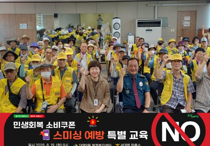 [뉴스다컴] 대구 남구 대명9동에서 지난 19일 관내 서대명파출소와 협력하여 노인 60여 명을 대상으로 민생회복 소비쿠폰 사칭 스미싱 및 보이스피싱 예방 특별교육을 실시했다.
