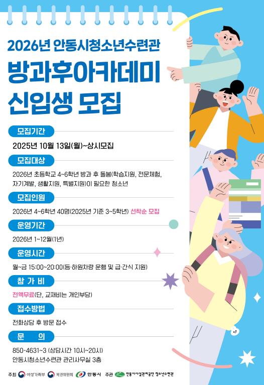 [뉴스다컴] 안동시시설관리공단이 운영하는 청소년수련관 방과후아카데미가 오는 10월 13일부터 2026년도 신입생 모집을 시작한다.