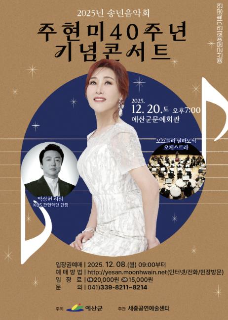 [뉴스다컴] 예산군문예회관은 2025년 송년을 맞아 오는 12월 20일 오후 7시 ‘트롯 여제’ 주현미의 데뷔 40주년을 기념하는 콘서트를 개최한다.