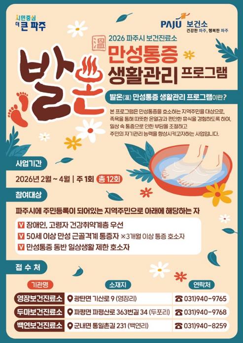 [뉴스다컴] 파주시 보건진료소는 보건의료 취약지역 주민들의 건강증진을 위해 2026년 ‘발온(溫) 만성통증 생활관리’교실을 운영한다.
