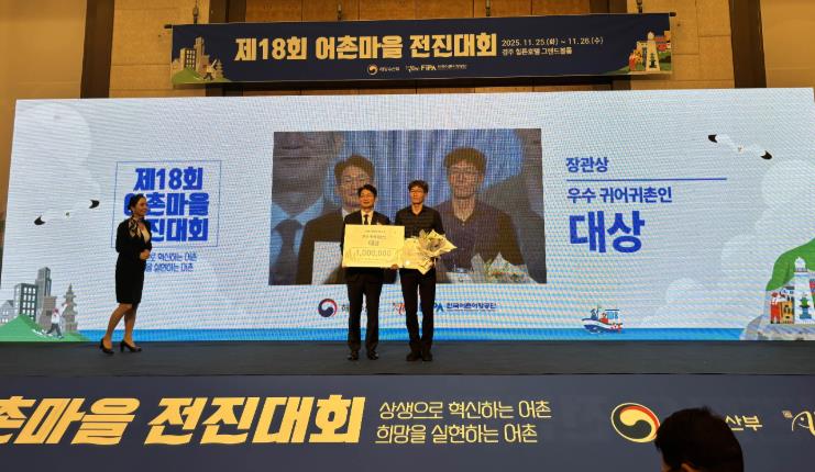 [뉴스다컴] 전라남도해양수산과학원은 오늘 경주에서 열린 제18회 어촌마을 전진대회에서 2020년 전남귀어학교 제2기 수료생인 완도 김진호(46) 씨가 우수 귀어귀촌인 대상에 선정돼 해양수산부 장관 표창을 받았다고 밝혔다.