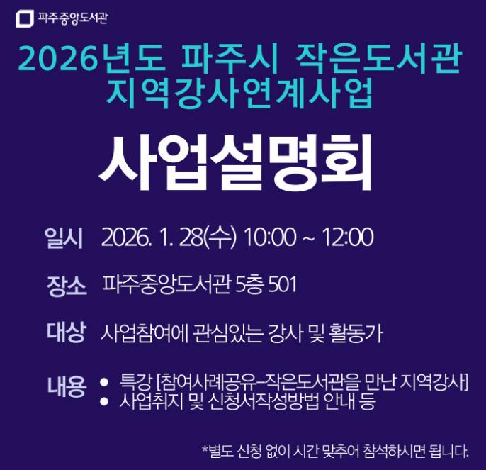 [뉴스다컴] 파주시 중앙도서관은 지역의 작가, 예술가, 독서문화 활동가 등 인재를 발굴해 작은도서관의 독서문화 프로그램을 지원하는 녪년 작은도서관 지역강사 연계사업’에 참여할 지역강사를 모집한다.