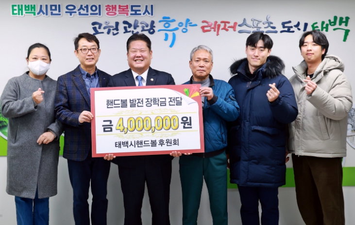 [뉴스다컴] 태백시는 태백시핸드볼후원회(회장 우병선)가 지역 핸드볼 꿈나무 육성을 위해 총 400만 원 규모의 핸드볼 발전 장학금을 관내 4개 학교(황지초등학교, 세연중학교, 황지정보산업고등학교, 철암고등학교)에 전달했다고 밝혔다.