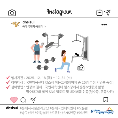 [뉴스다컴] 동해시시설관리공단(이사장 이용빈)은 연말연시를 맞아 시민들의 건강관리 장려하고 헬스장 이용 활성화를 위해 '송구신년 건강실천 오운완 SNS 인증 이벤트'를 개최한다고 밝혔다.