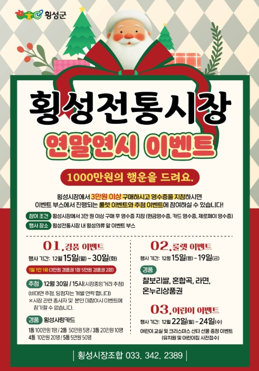 이번 연말행사는 지난 12월 15일부터 30일까지 횡성전통시장에서 진행되며, 기간 중 3만 원 이상 구매 고객을 대상으로 경품추첨 및 롤렛 이벤트를 매일 오전 10시부터 오후 4시까지 진행한다.