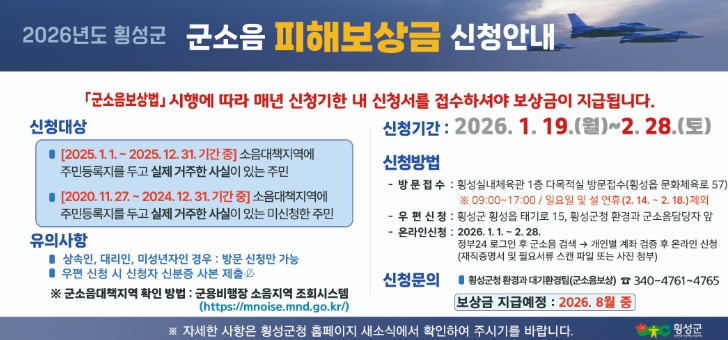 | ▲ 횡성군, 26년도 군용기 소음피해 보상금 접수 시작 |
