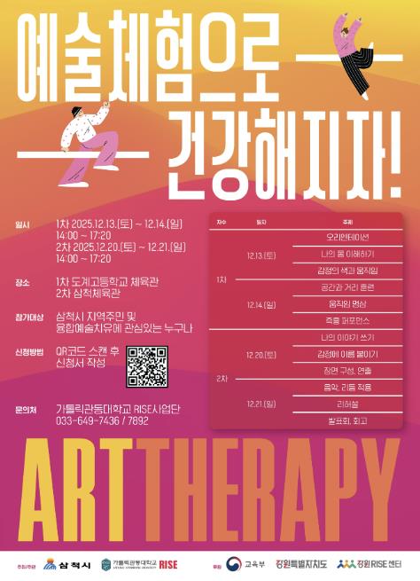 [뉴스다컴] 삼척시는 가톨릭관동대학교 RISE 사업단과 협력하여 지역 자연자원을 활용한 ‘융합예술치유 프로그램’을 오는 12월 도계고등학교 체육관과 삼척체육관에서 개최한다.