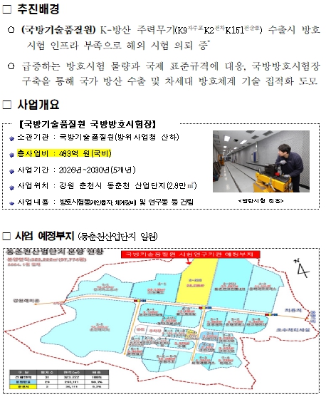 국방방호시험장은 동춘천산업단지 내 약 2.8만㎡ 부지에 조성될 예정으로, 2030년까지 국비 483억 원을 투입해 완전 방음시설을 갖춘 연구동·시험동 등 국가 수준의 방호시험 인프라로 구축된다.
