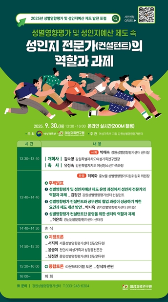 [뉴스다컴] 강원특별자치도여성가족연구원에서는 9월 30일 오후 1시 30분, 온라인 실시간(ZOOM활용)으로 ‘2025년 성별영향평가 및 성인지예산 제도 발전 포럼’을 개최했다.