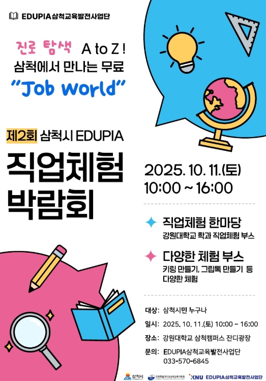 [뉴스다컴] 삼척시와 EDUPIA삼척교육발전사업단은 오는 10월 11일 오전 10시 강원대학교 삼척캠퍼스 잔디광장에서 ‘제2회 삼척시 EDUPIA 직업체험 박람회’를 개최한다고 밝혔다.