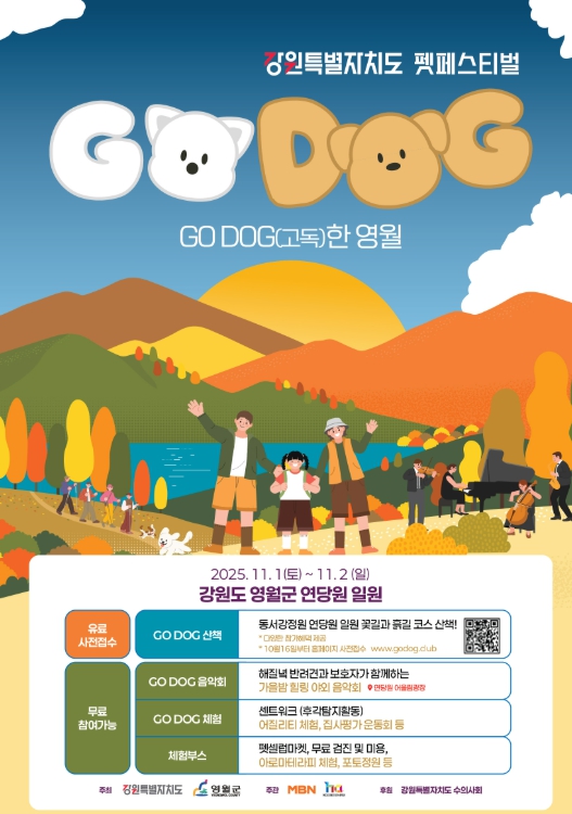 [뉴스다컴] 강원특별자치도와 영월군이 주최하고 MBN과 HA인터렉션이 주관하는 ‘고독(GO DOG)한 영월’ 펫 페스티벌이 11월 1일부터 11월 2일까지 동서강정원 연당원에서 열린다.