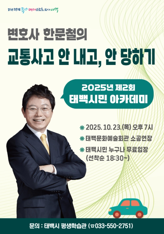 [뉴스다컴] 태백시는 시민들의 교통안전 의식을 높이고 사고 예방 문화를 확산하기 위해 오는 23일 오후 7시, 태백문화예술회관 소공연장에서 ‘제2회 태백시민 아카데미’를 개최한다고 밝혔다.
