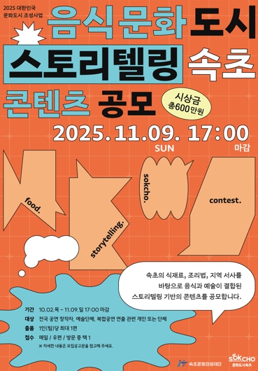이번 공모는 속초의 식재료, 조리법, 지역 서사를 바탕으로 음식과 예술을 결합한 융합형 콘텐츠 개발을 목표로 한다. 이를 통해 도시 정체성을 널리 알리고 문화도시로서의 경쟁력을 높일 계획이다.
