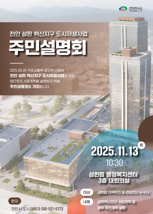 이경열 도시주택국장은 “성환 혁신지구 도시재생사업은 성환 지역 활성화를 위해 오랜 기간 준비해 온 사업인 만큼, 주민과 함께 소통해 추진해 나갈 것”이라며 “많은 주민께서 설명회에 참석해주시길 바란다”고 밝혔다.