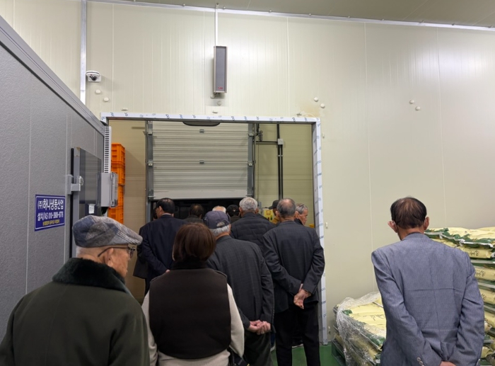 | ▲ 대한노인회 청양군지회 직원과 경로당 분회장들이 대치면 먹거리종합타운을 둘러보며, 무상급식 및 공공급식 사업 관련 현장을 점검하고 있는 모습 |